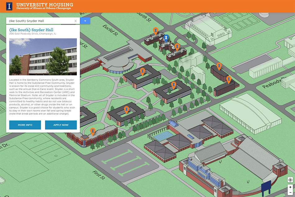 Locations Map is a fun, interactive feature that gives a sense of position for University Housing resident halls. This is most helpful when perspective students are in the process of determining where they will live while at the university. I spent a lot of time making sure the UI was polished and interactivity worked seamlessly. Map art provided by Greg Maxson.